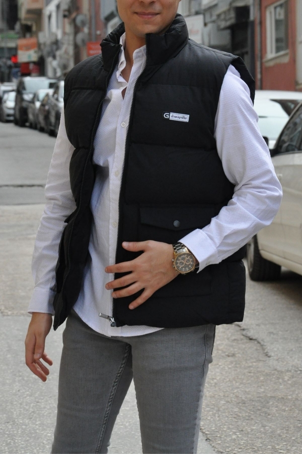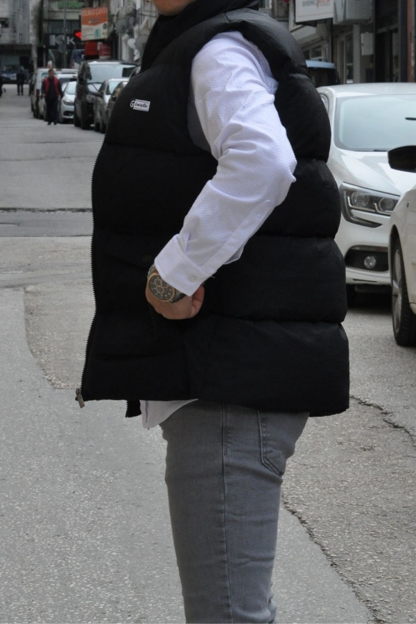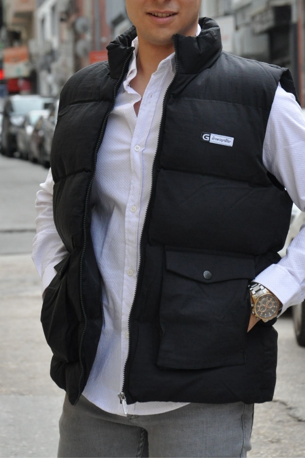 Dik Yaka Torba Cep Siyah Şişme Yelek