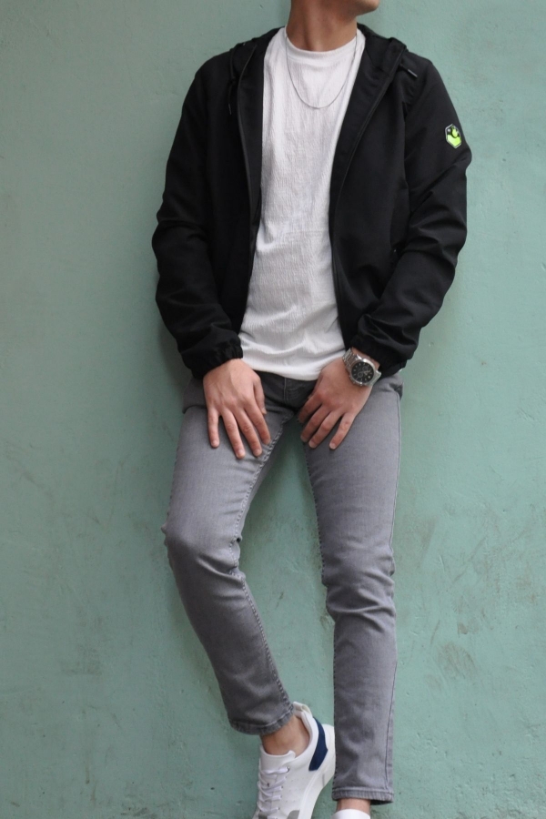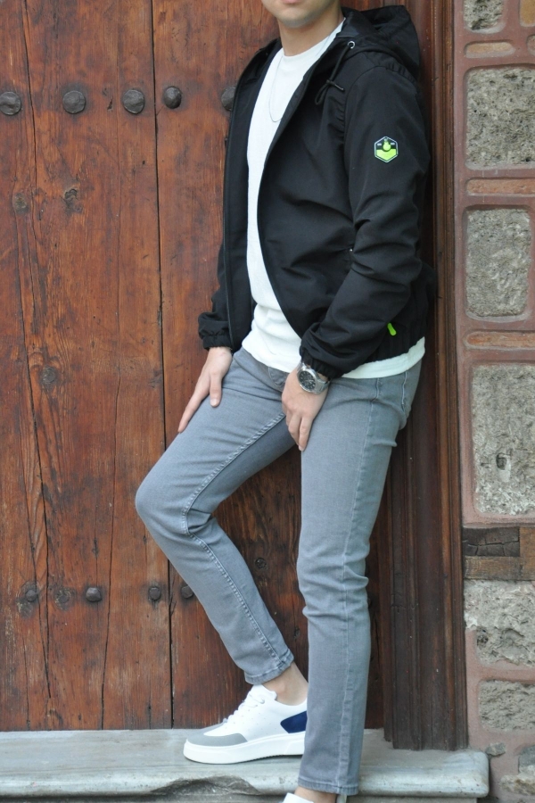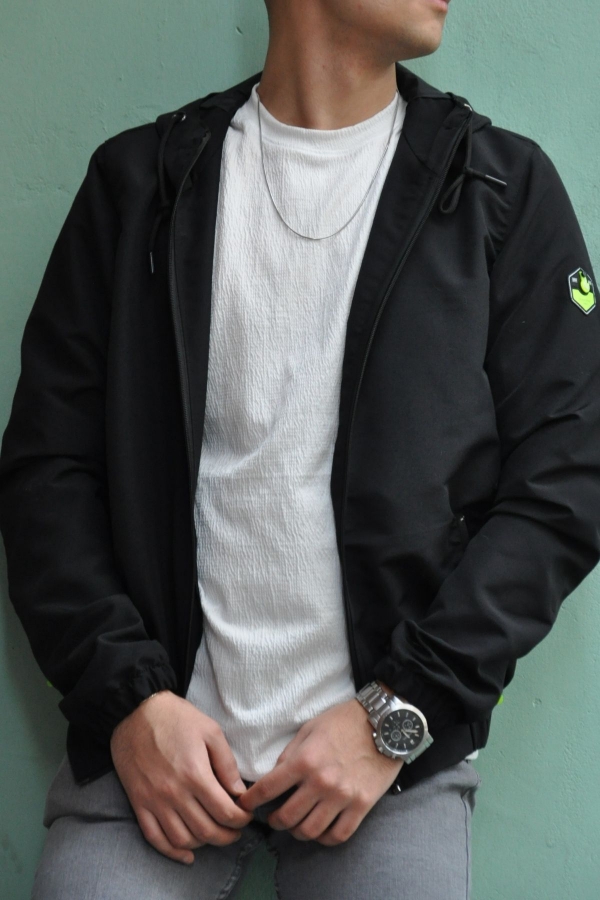 Kapüşonlu Fermuarlı Neon Detaylı Cepli Siyah Erkek Ceket Mont