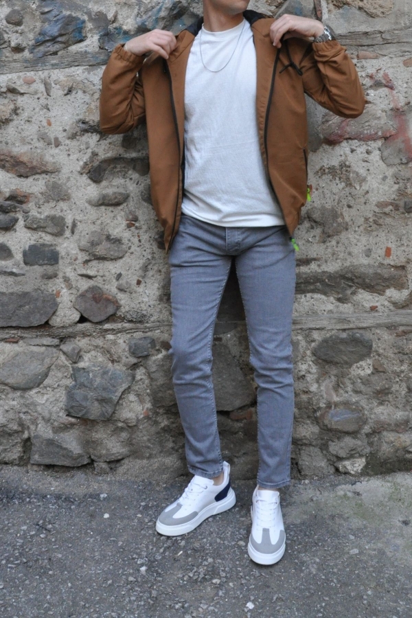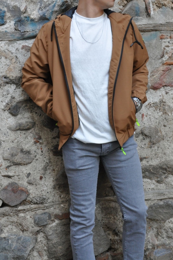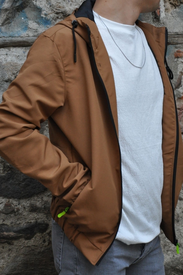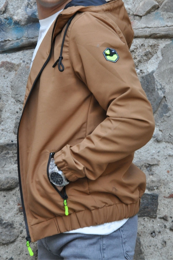 Kapüşonlu Fermuarlı Neon Detaylı Cepli Taba Erkek Ceket Mont