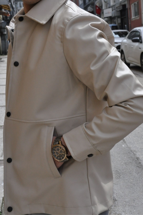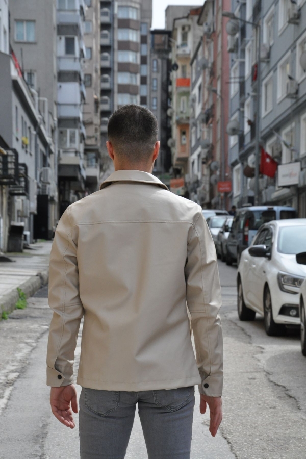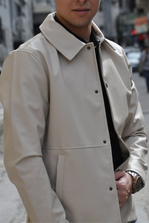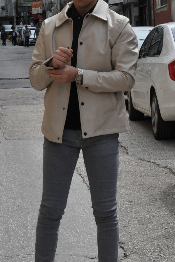Polo Yaka Regular Suni Kırık Beyaz Deri Ceket %100 polyester olup, panzet kumaştır.