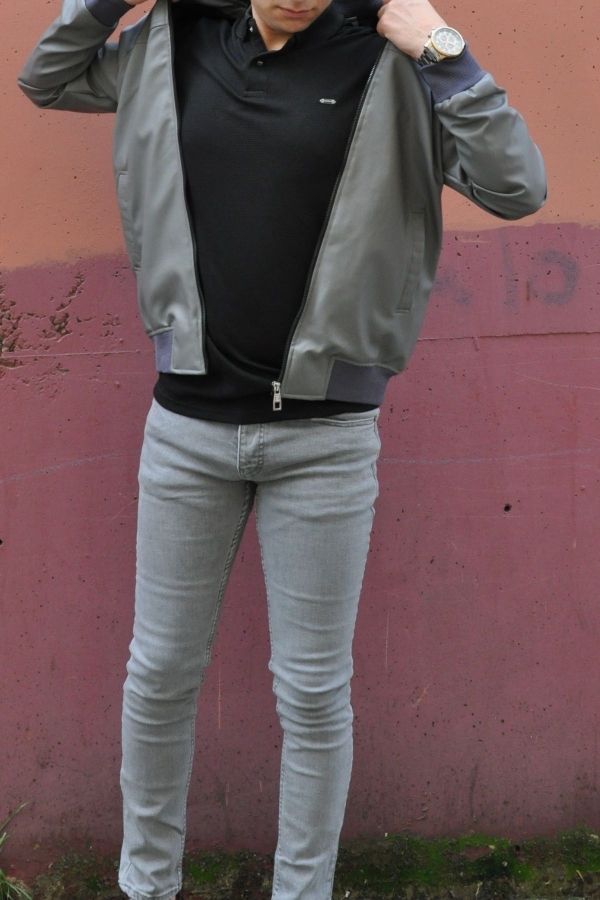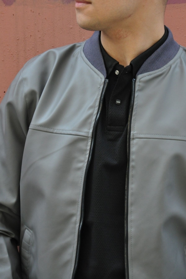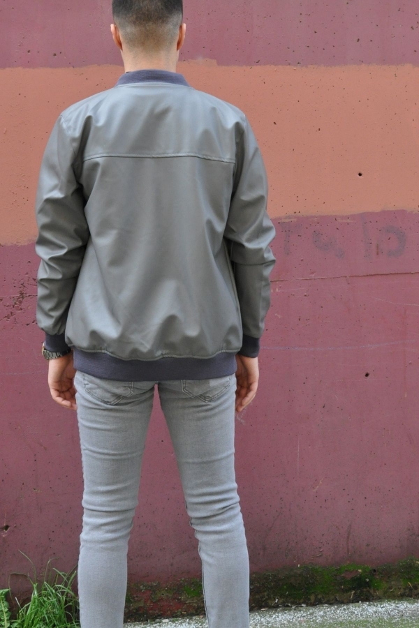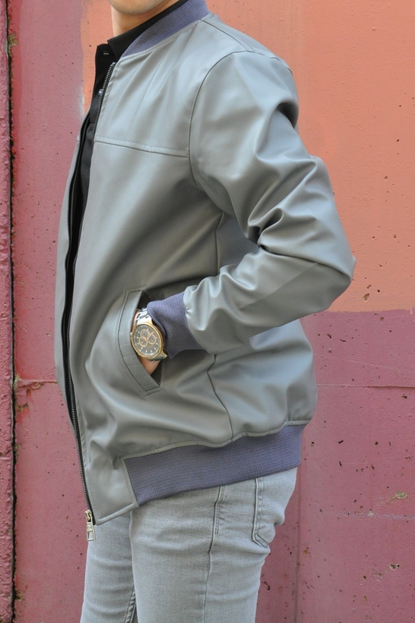 Slim Fit Deri Kolej Yaka Bomber Gri Ceket