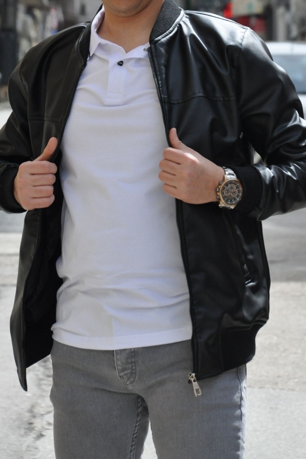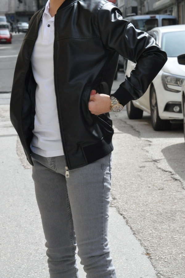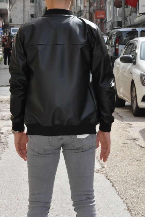 Slim Fit Deri Kolej Yaka Bomber Siyah Ceket