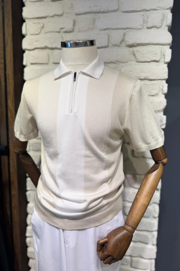 Triko Bej Fermuarlı Polo Yaka T-Shirt Çizgili