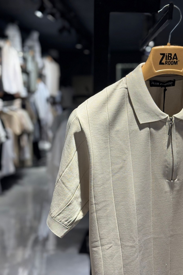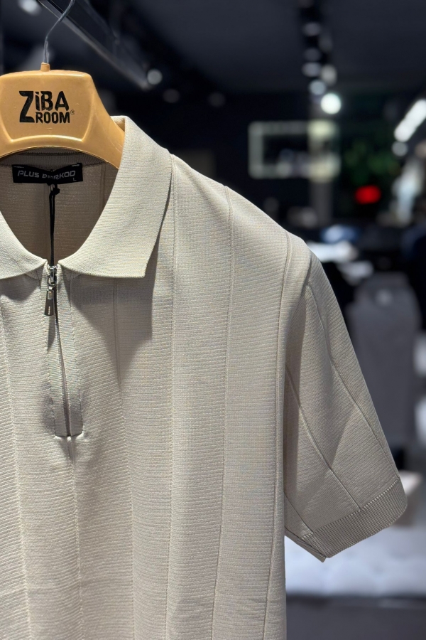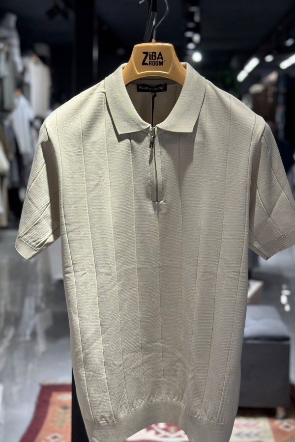Triko Bej Fermuarlı Polo Yaka T-Shirt Düz