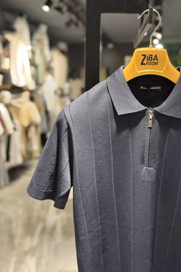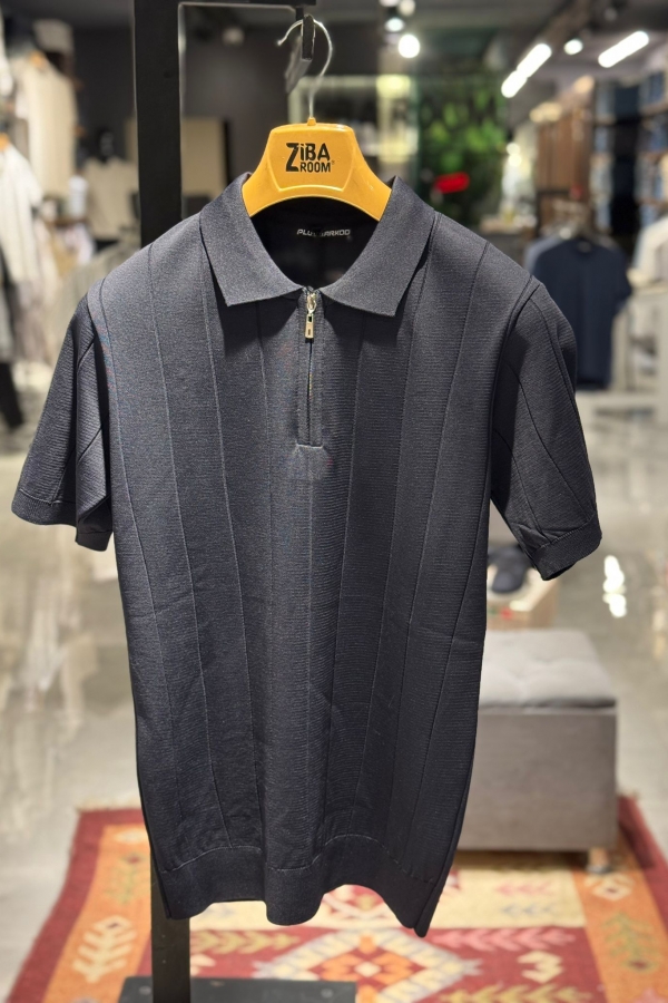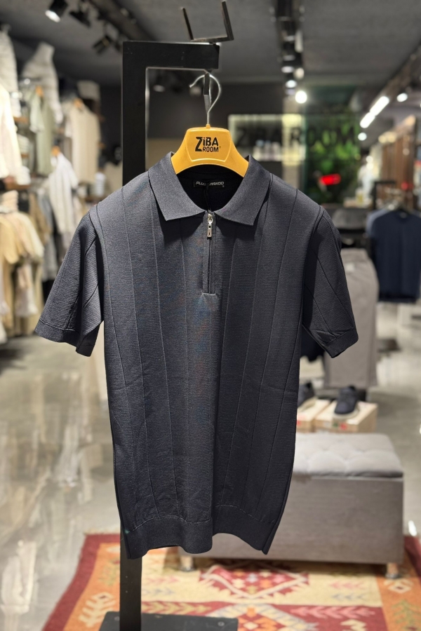 Triko Lacivert Fermuarlı Polo Yaka T-Shirt Düz
