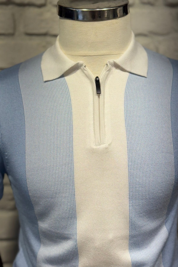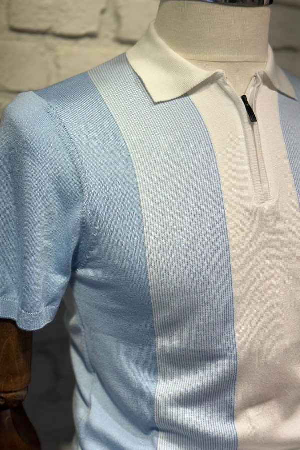 Triko Mavi Fermuarlı Polo Yaka T-Shirt Çizgili