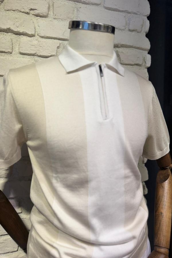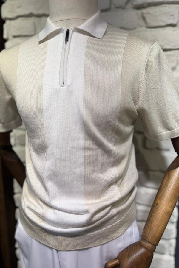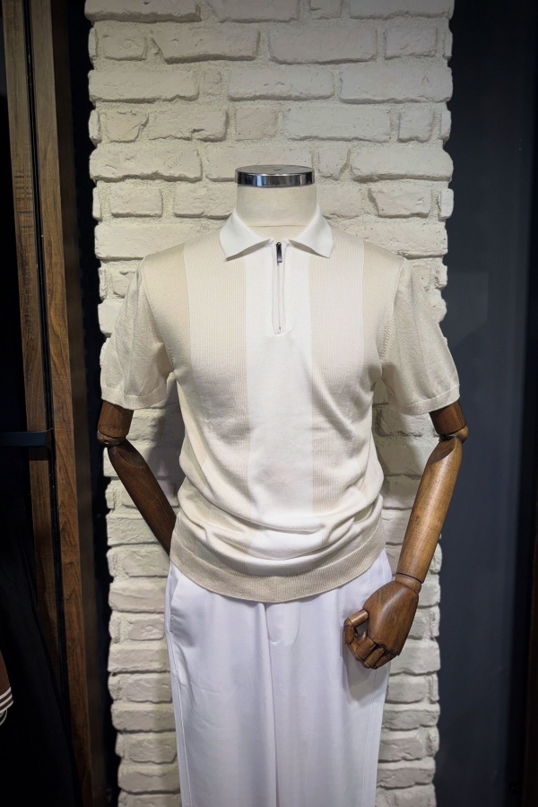 Triko Bej Fermuarlı Polo Yaka T-Shirt Çizgili