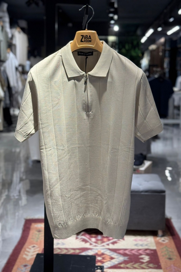 Triko Bej Fermuarlı Polo Yaka T-Shirt Düz