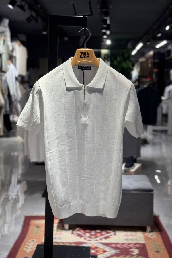 Triko Beyaz Fermuarlı Polo Yaka T-Shirt Düz