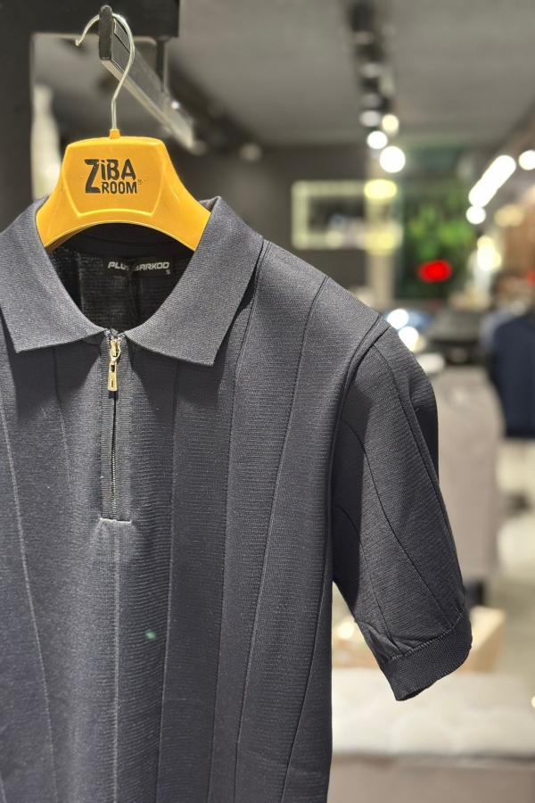 Triko Lacivert Fermuarlı Polo Yaka T-Shirt Düz