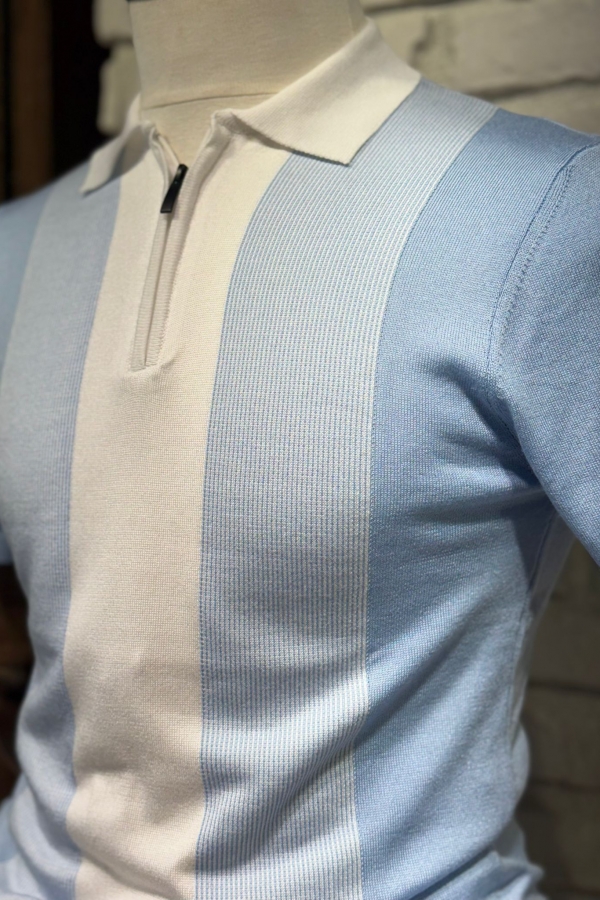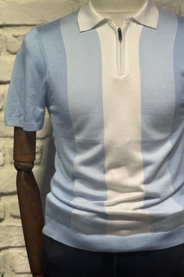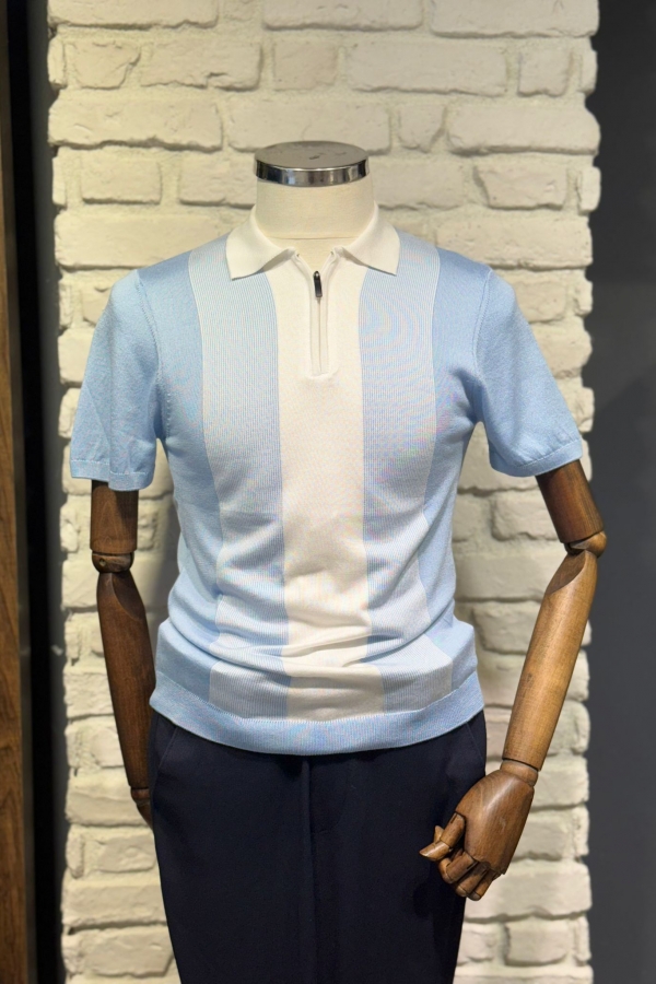 Triko Mavi Fermuarlı Polo Yaka T-Shirt Çizgili