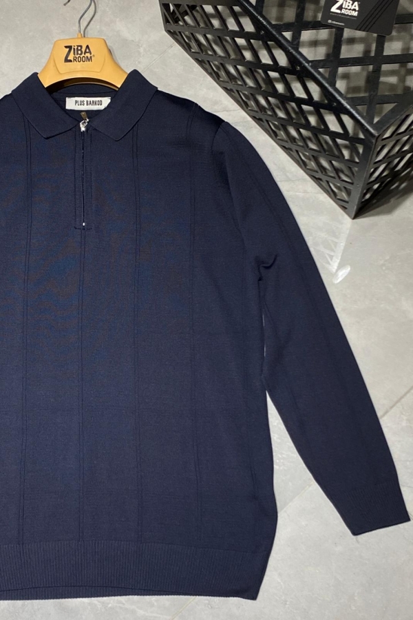 Yakalı Fermuarlı Çizgili Triko Kazak